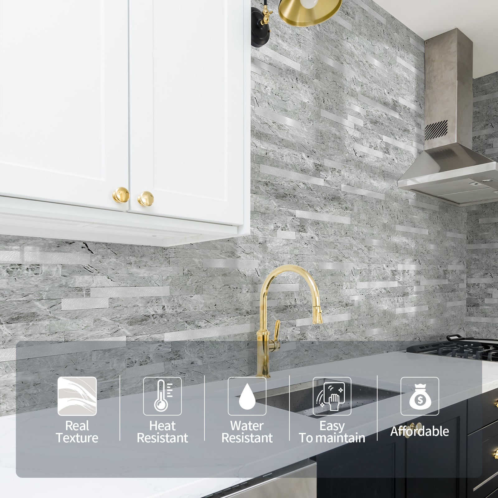 12" X 12" Grey Stone With Metal Peel & Stick Backsplash Linear Blend Tile