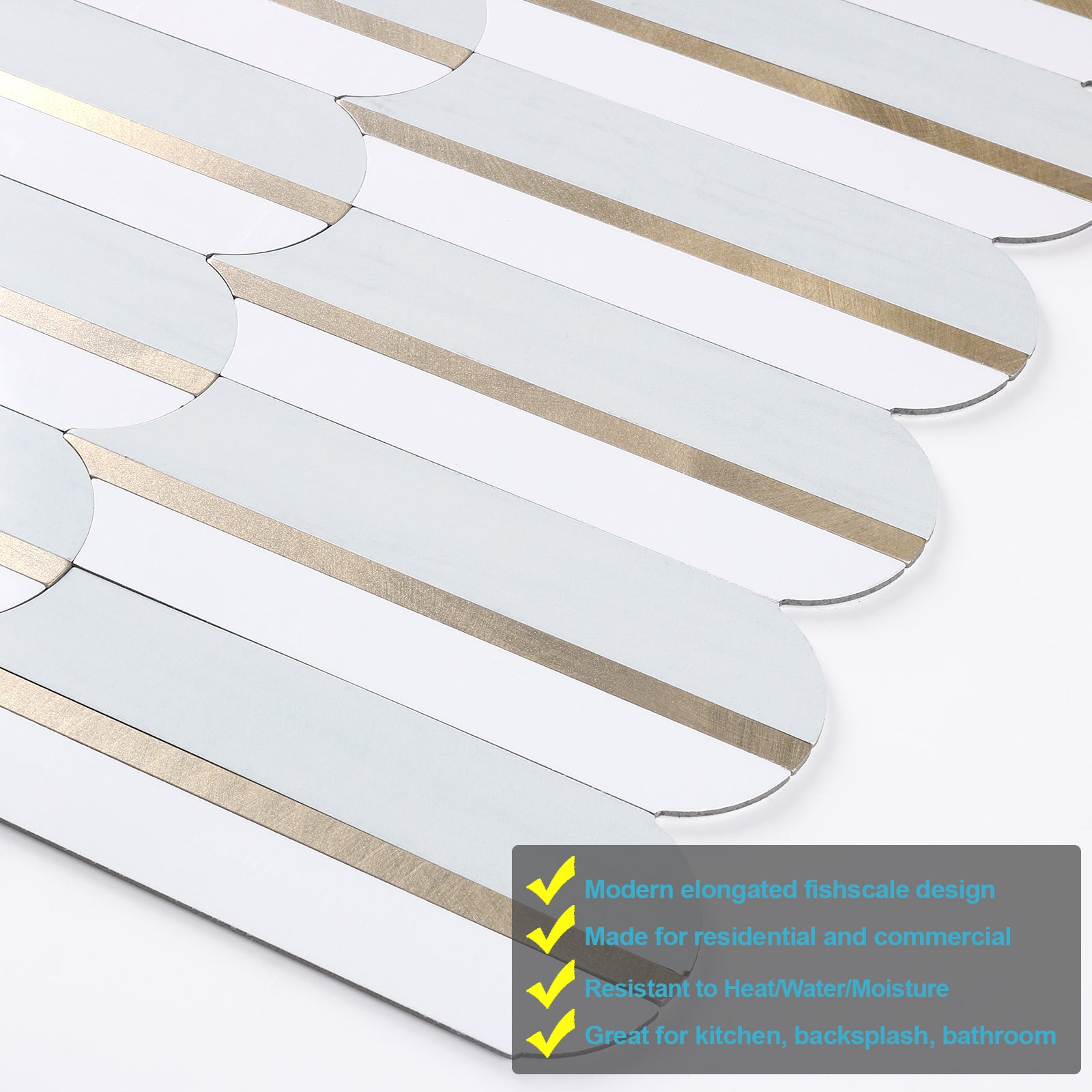 Transform your home with the elegant allure of Glossy Dolomite & White Gold Fish Scale Peel and Stick Tiles.